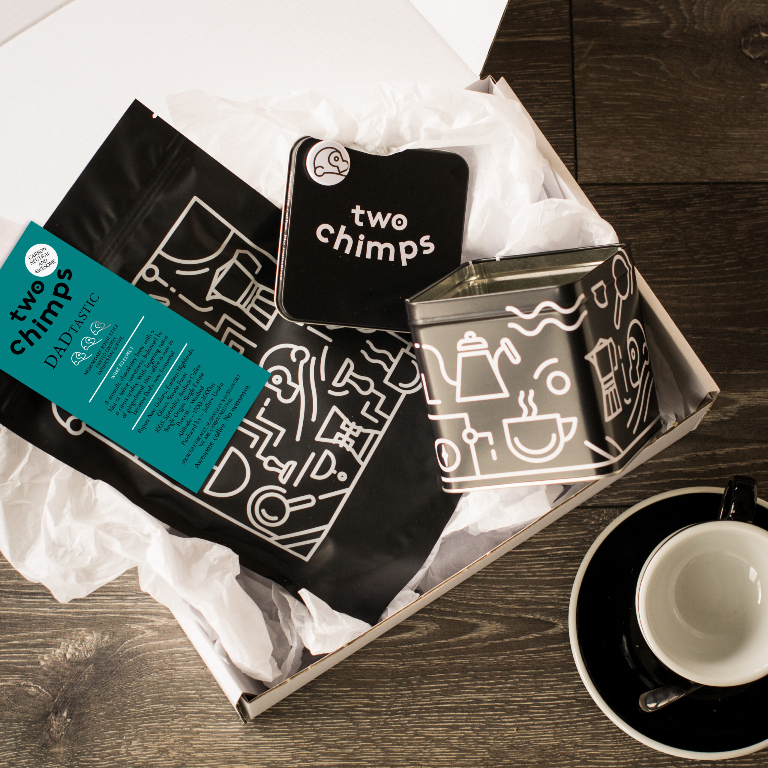Level up to give Dad a Two Chimps storage tin, magnet, and coffee, all gift-wrapped in our premium ribbon-tied white gift box. You can also add a gift note for that personalised touch whilst checking out!